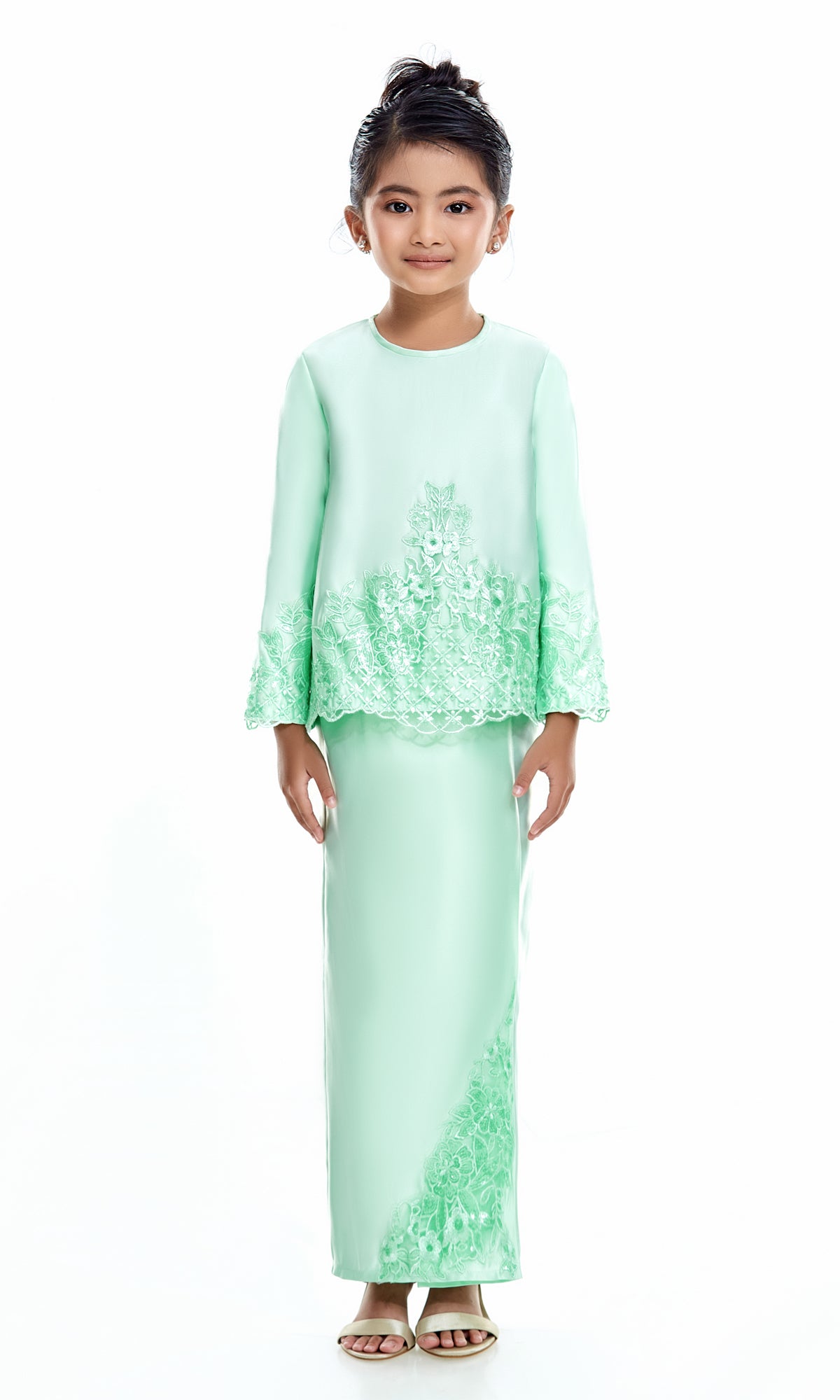 - Embroidered lace embellishment with hand beading details on kurung and sleeve.