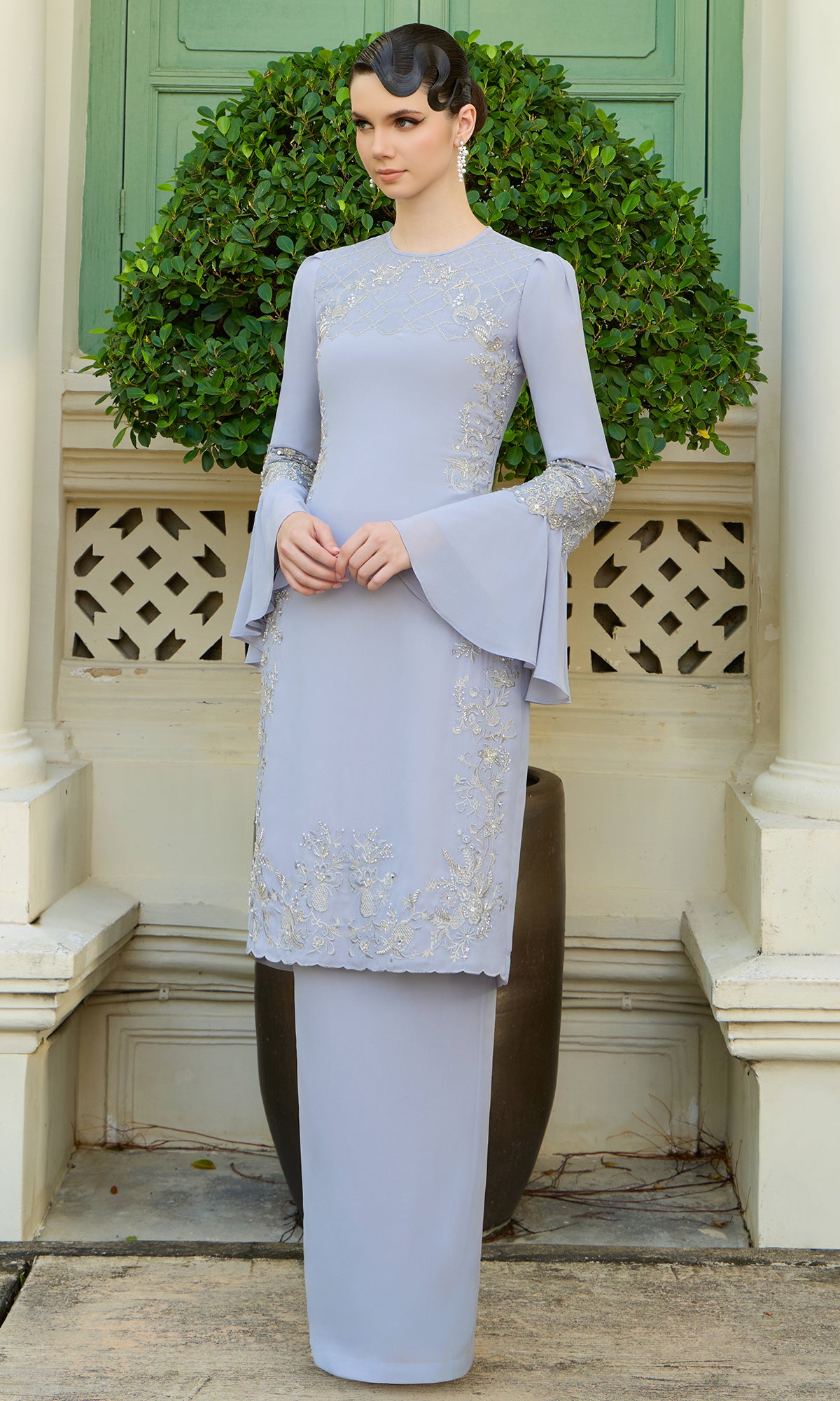 - Floral embroidery details with hand beading along both sides and bottom of the kurung