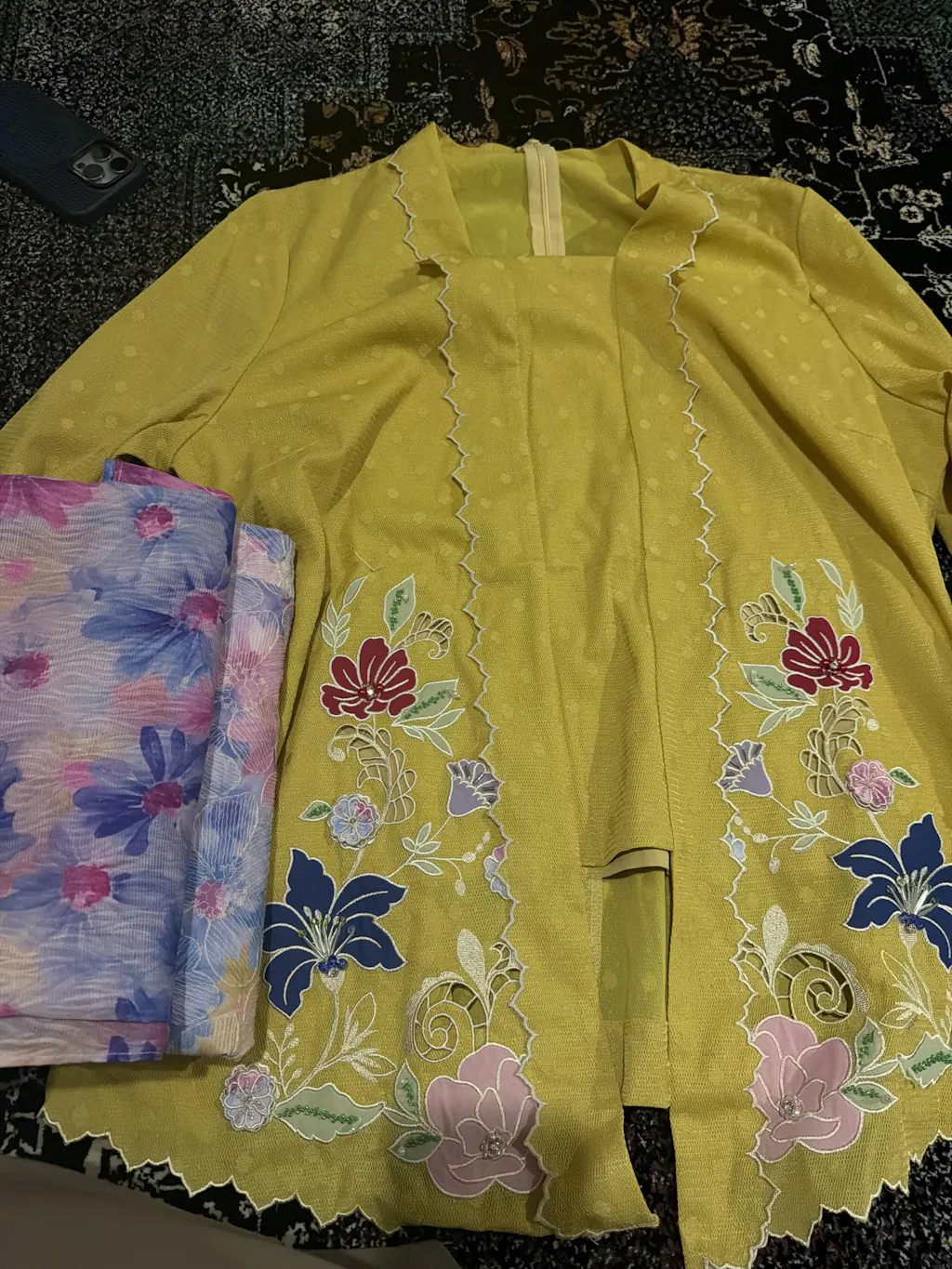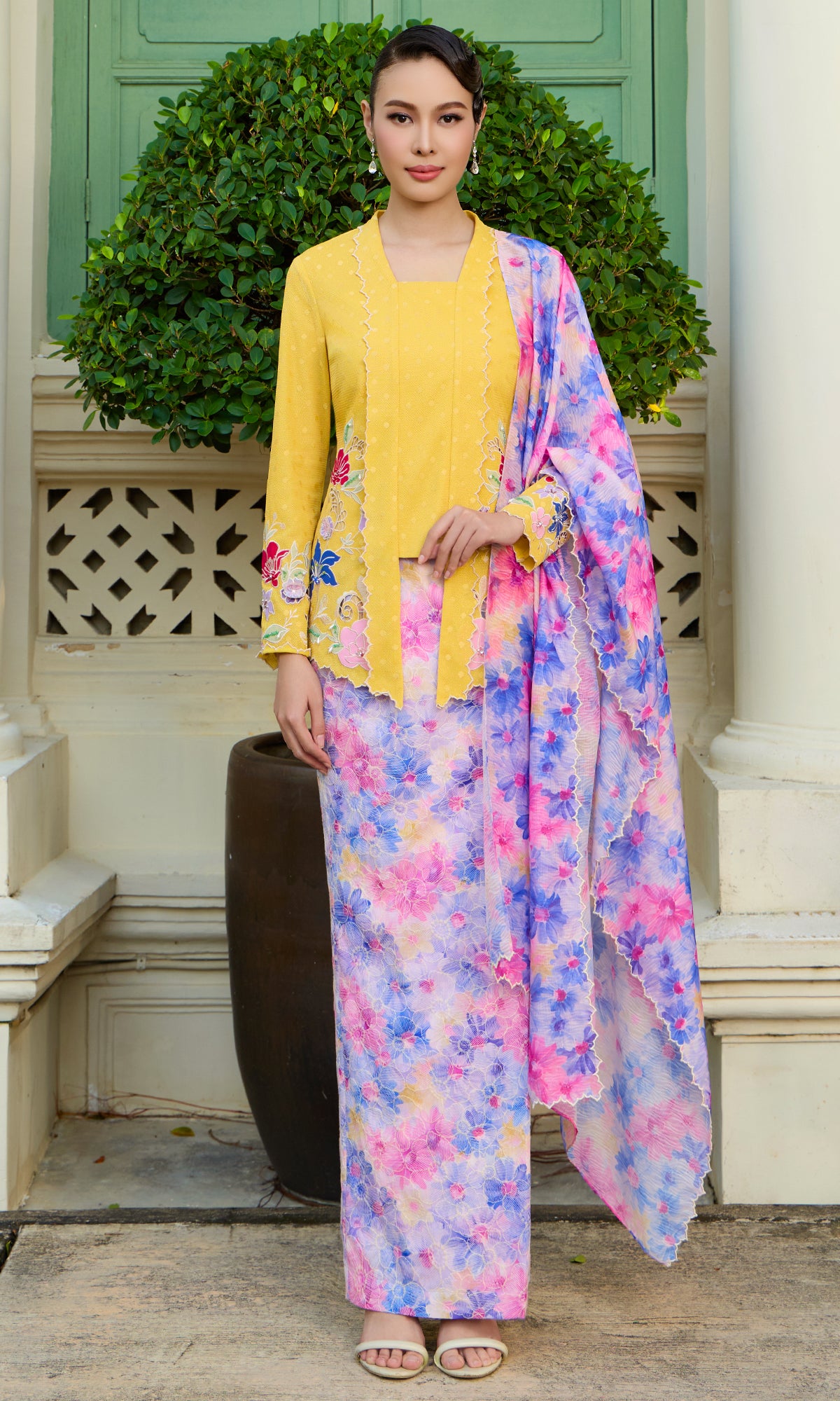 - Floral motif embroidery embellishment with hand beaded details on kurung and sleeve