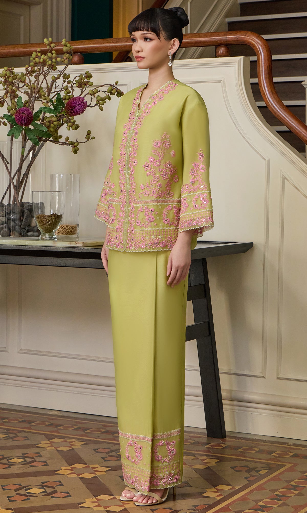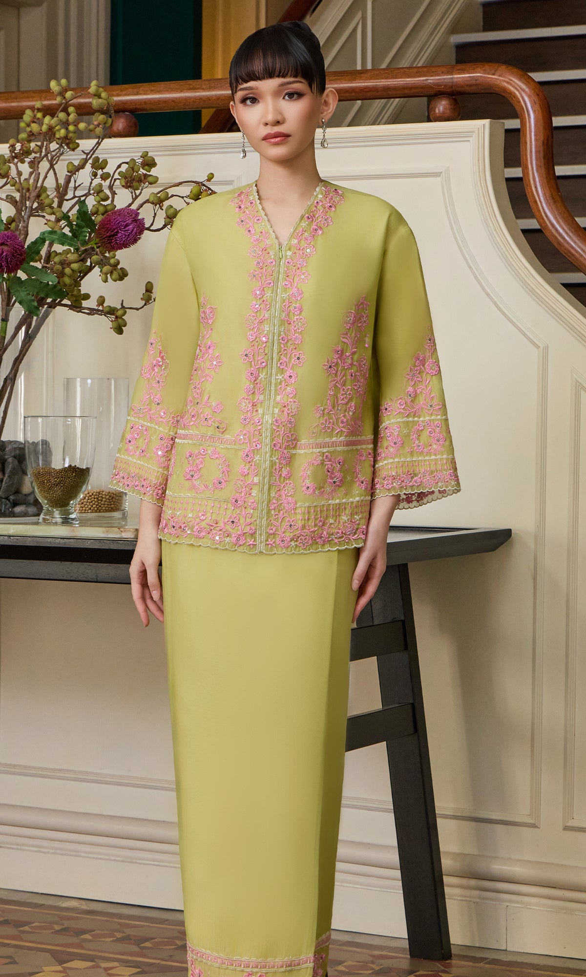 - Custom embroidery embellishment with hand beading details on kurung, sleeve and skirt