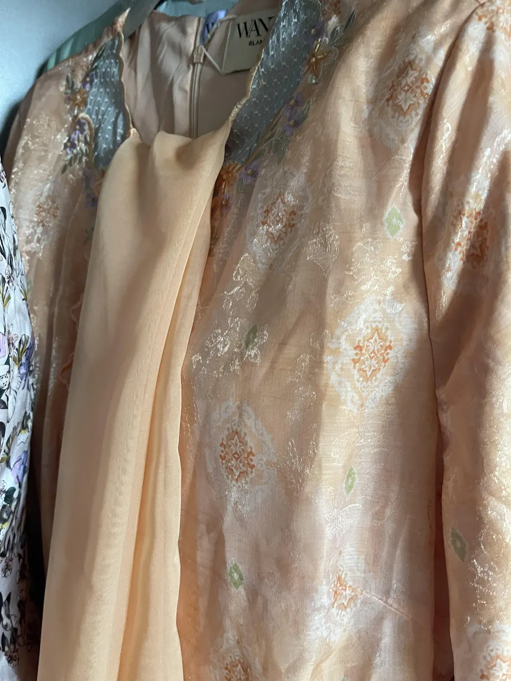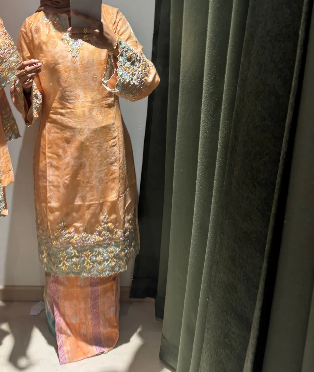 - Embroidery with hand beaded embellishment on kurung and sleeve