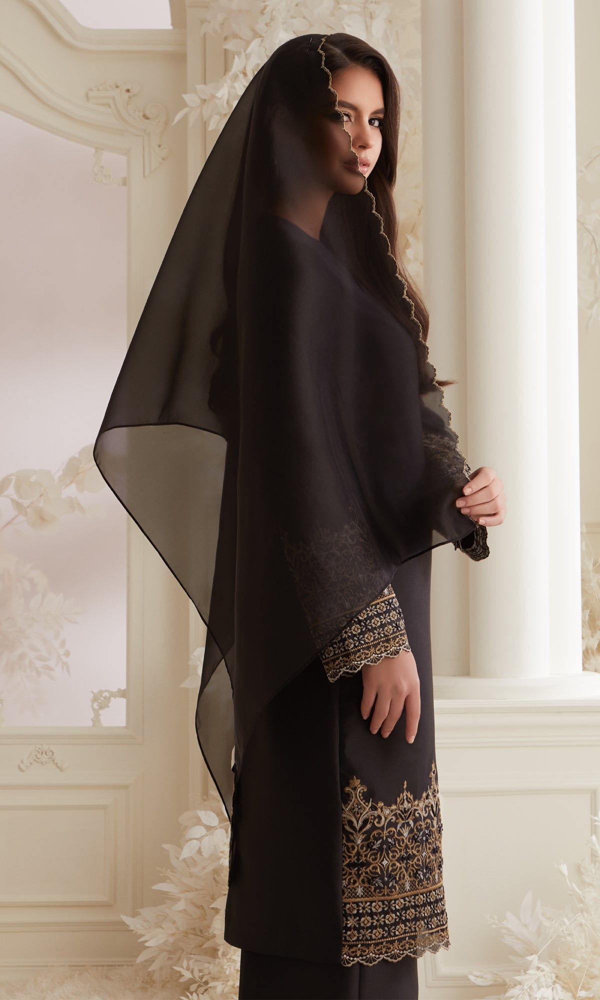 - Graceful silhouette the scallop embroidery outlines the selendang with a couture-inspired finish.