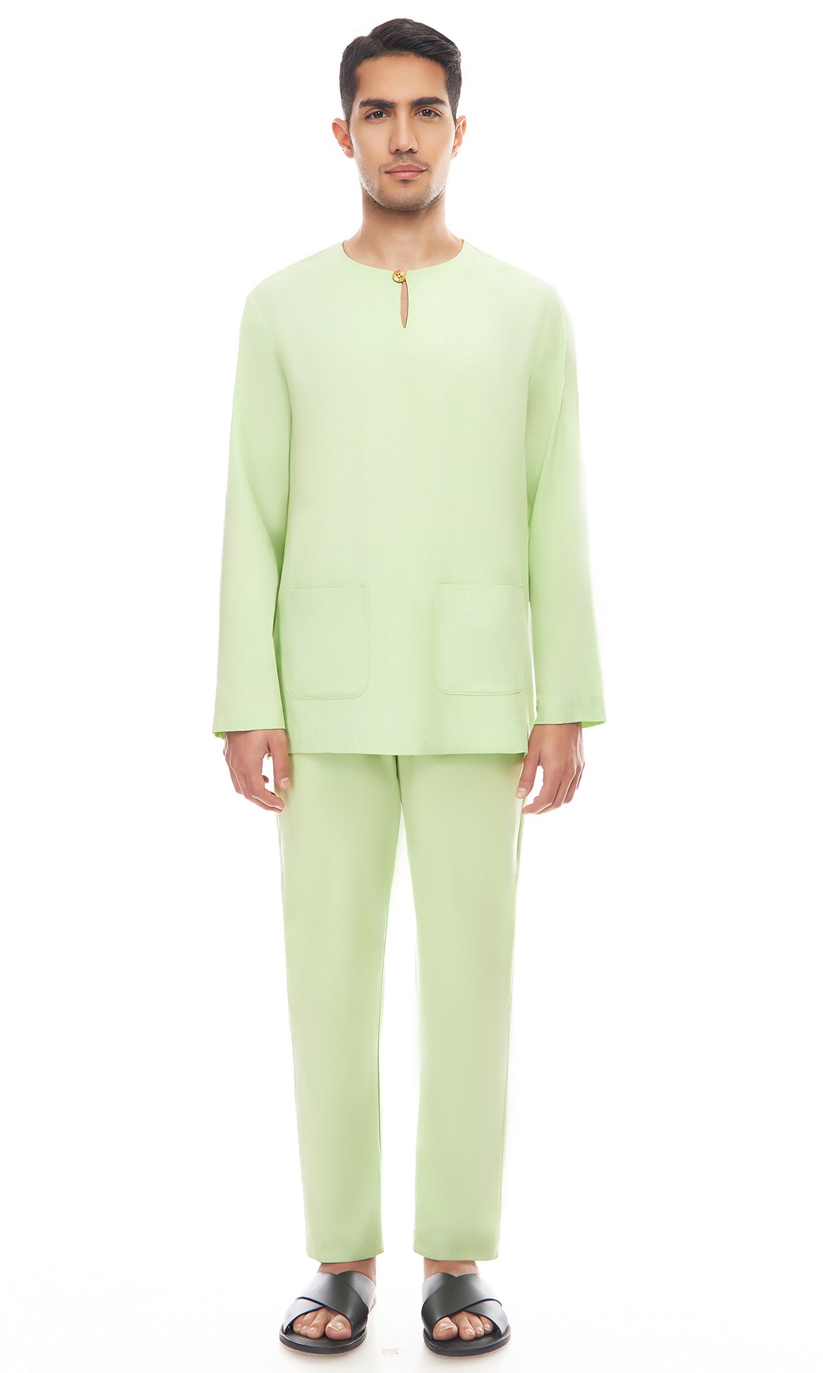 - Rounded neckline with button