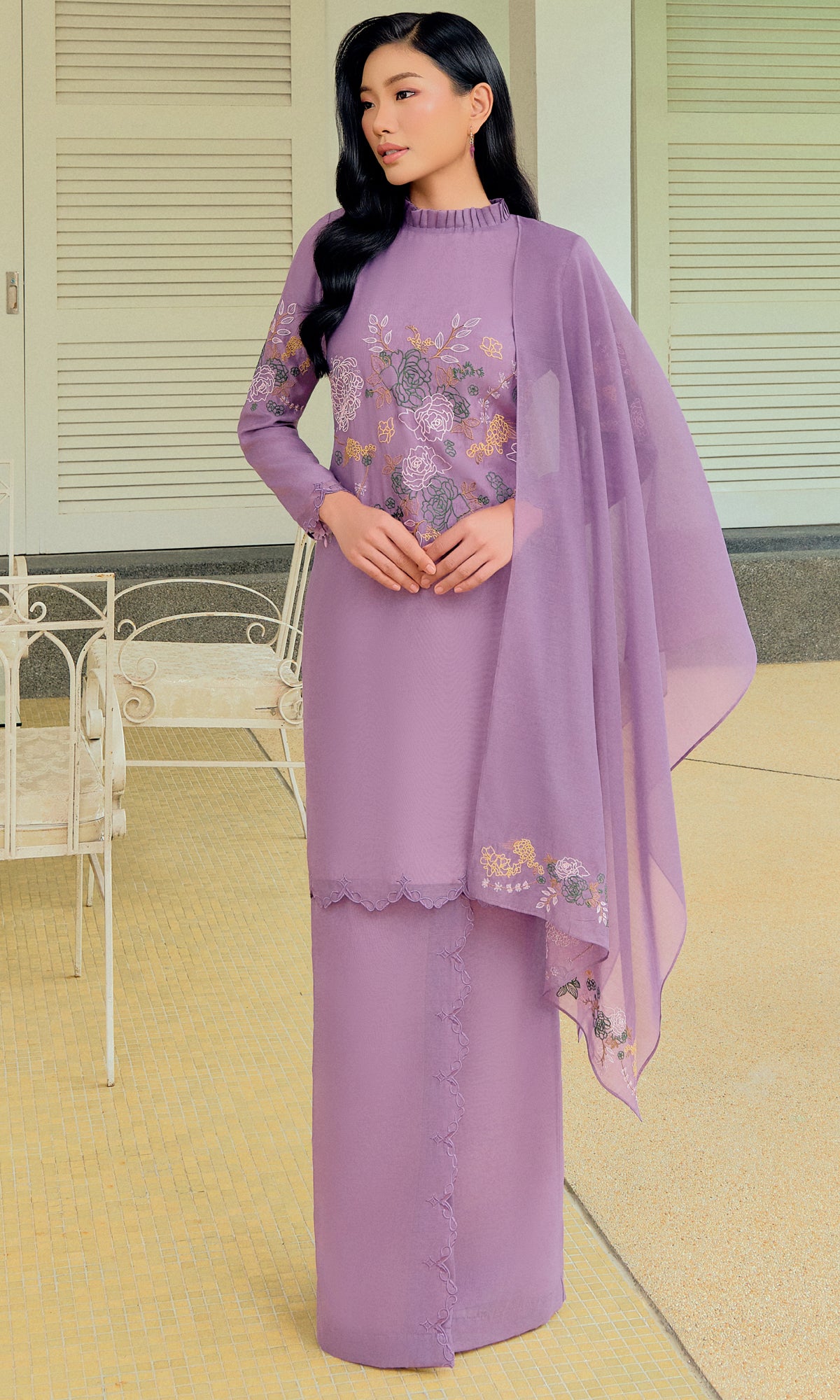 - Cut: Long, fitted kurung with a straight silhoutte,finished with scallop embroidery on the bottom hem