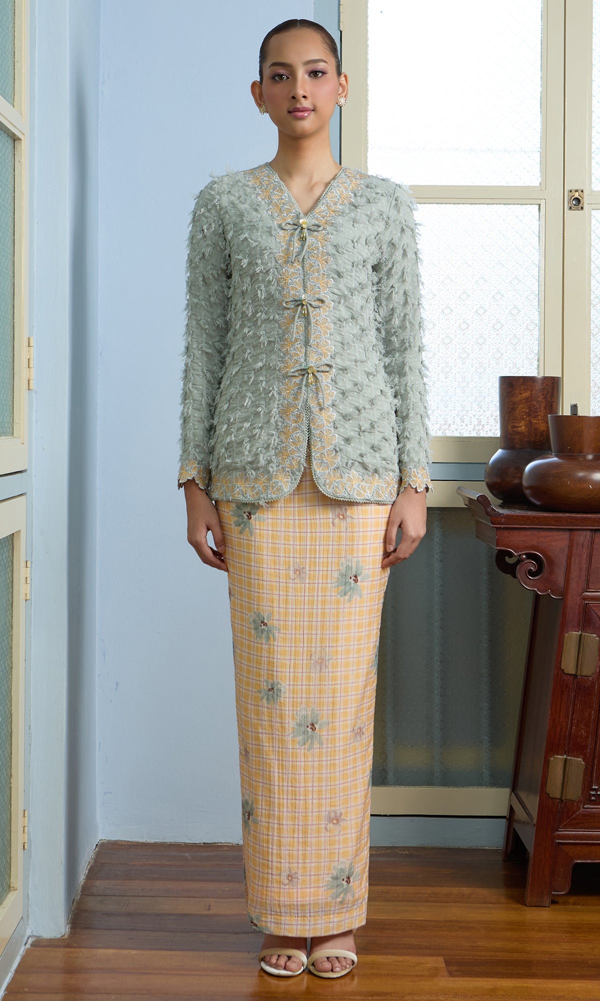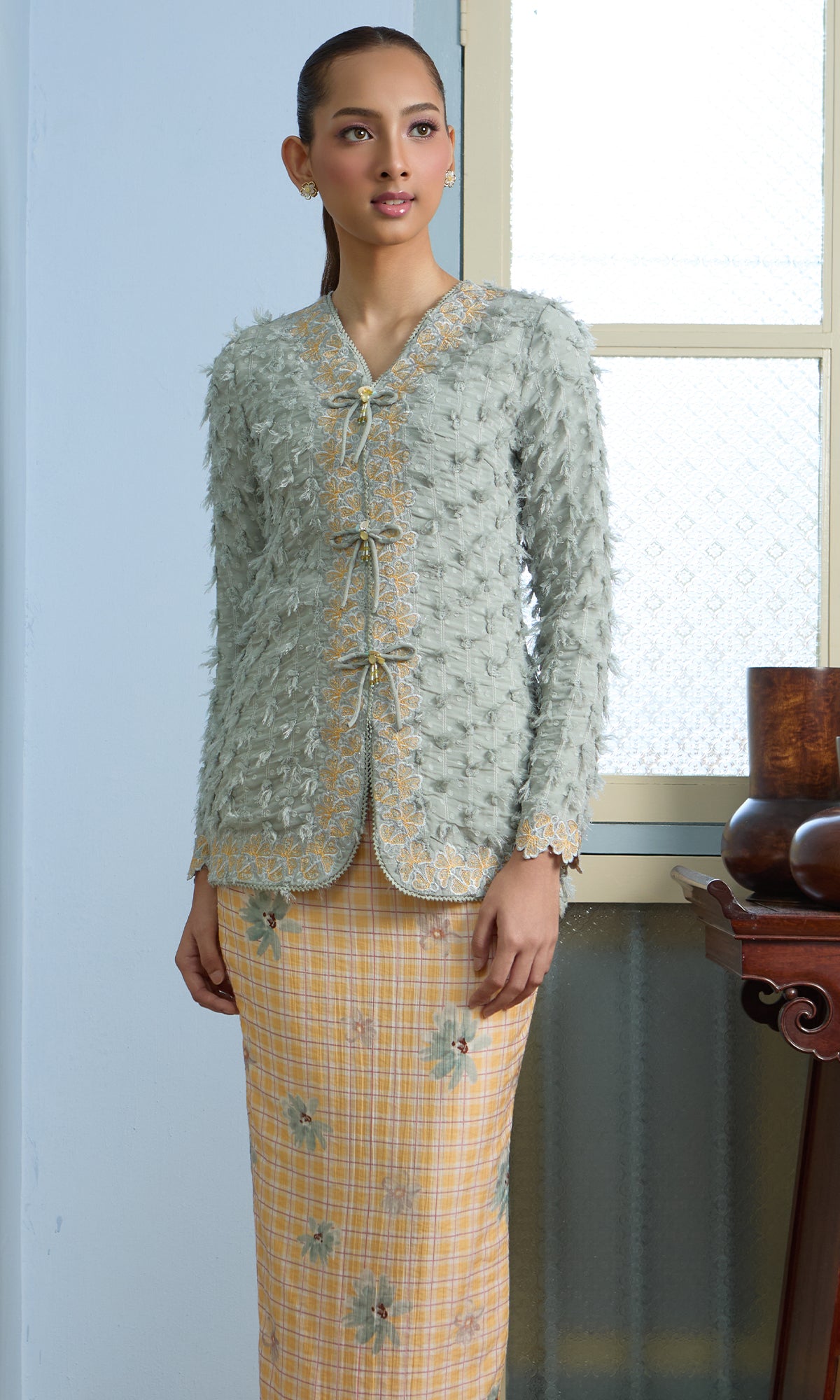 - Embroidered details across the neckline and kurung
